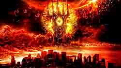 ""სამ ნაწილად გაიყო დიდი ქალაქი, დაემხნენ წარმართთა ქალაქები და მოხსენიებულ იქნა დიდი ბაბილონი ღვთის წინაშე რათა სასმისით მისცემოდა ღვინო მისი მძვინვარების რისხვისა. ყველა კუნძული გაიქცა და მთები გაუჩინარდნენ".